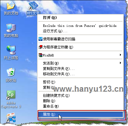 一、在桌面右击”WPS文字“快捷方式,选择“属性”。