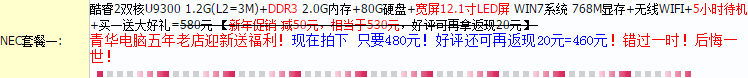 基本配置:酷睿2双核U9300 1.2G(L2=3M)、1G显卡、12.1寸LED宽屏