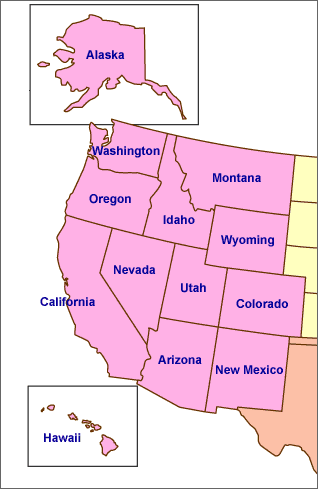 西部地区中,含北加利佛尼亚在内的北方的年降雨量较大,11月至4月间经常雨水连绵不断。气候温暖适合居住,到冬季时山上还有降雪。在地中海气候的温暖的加利佛尼亚州中南部,4月至10月间降雨量极少。亚利桑那、新墨西哥等的南部,年降雨量较少使得气候比较干燥。典型特征是昼夜温差巨大,冬季也难看到降雪。而在山脉地带,气温也并不太高,冬季还能看到较多的降雪。